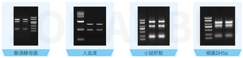以上參考圖分別取50mg酵母濕菌、500μl人血液、20mg小鼠肝臟和1ml細菌DH5α菌液,組織進行液氮研磨處理,菌液離心收集細胞后,分別按對應試劑盒說明書進行RNA提取。洗脫體積分別為100μl、60μl、60μl、80μl。RNA電泳上樣量分別為5μl,1%瓊脂糖凝膠電泳。M: DL2000(ZOMANBIO) 人血液RNA圖為MarkerⅥ(ZOMANBIO) | |||||