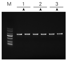 ![]() | 注解:三個月穩定性實驗結果圖 柑橘內參基因GAPDH 1kb擴增結果 RNA使用量為50 ng 1:4℃保存 2:37℃保存 3:-20℃保存 M:莊盟DL2000(3μl點樣) |