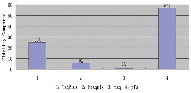 | 更高的保真性 保真性高于普通Taq DNA聚合酶25倍。( LacZ測定法 ) | ![]() |