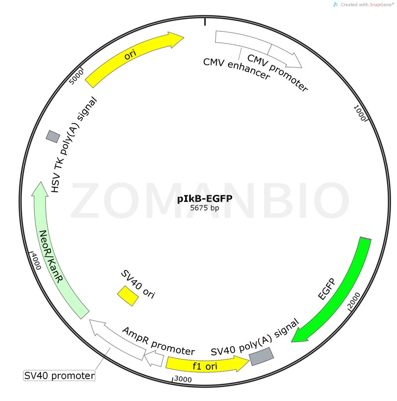 pIkB-EGFP(NM_020529.2)是一個人源基因哺乳細胞過表達質粒。質粒只保證關鍵序列正確,不保證表達效果。