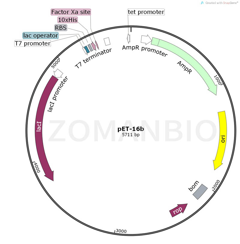 pET-16b質粒是一種原核表達載體,N端含有一個10×His標簽、Factor Xa酶切位點和BamHI限制性內切酶位點。表達由宿主細胞提供的T7 RNA聚合酶誘導,目的基因被克隆到質粒載體上,受噬菌體強轉錄及翻譯信號控制。
