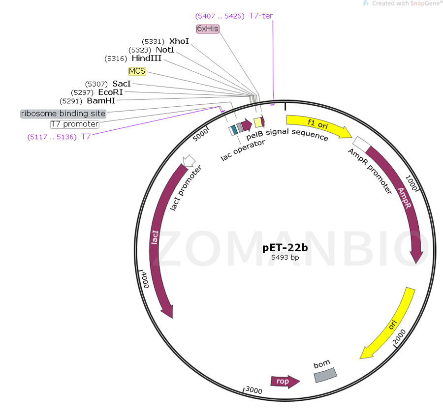 pET-22b質(zhì)粒是一種原核表達(dá)載體,N端含有一個(gè)pelB前導(dǎo)肽、C-端的His標(biāo)簽。該質(zhì)粒含有多個(gè)常用的酶切位點(diǎn),便于不同基因克隆。表達(dá)由宿主細(xì)胞提供的T7 RNA聚合酶誘導(dǎo),目的基因被克隆到質(zhì)粒載體上,受噬菌體強(qiáng)轉(zhuǎn)錄及翻譯信號(hào)控制。T7 RNA聚合酶啟動(dòng)的克隆和表達(dá)區(qū)域在質(zhì)粒圖譜中也被標(biāo)注了出來。質(zhì)粒的F1復(fù)制子是被定向的,所以在T7噬菌體聚合酶的作用下,包含有蛋白編碼序列的病毒 粒子能夠產(chǎn)生,并啟動(dòng)蛋白表達(dá),同時(shí)蛋白表達(dá)將被T7終止子序列的作用下終止蛋白翻譯。