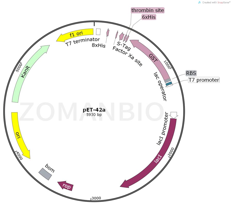 pET42系列載體是用來進行克隆和高水平表達含有220個氨基酸的GST融合純化標簽的蛋白表達載體。pET42a載體的單一的多克隆位點見上面的環狀質粒圖譜。注意:載體序列是以pBR322質粒的編碼規矩進行編碼的,所以T7蛋白表達區在質粒圖譜上面是反向的。T7 RNA聚合酶啟動的克隆和表達區域在質粒圖譜中也被標注了出來。質粒的F1復制子是被定向的,所以在T7噬菌體聚合酶的作用下,包含有蛋白編碼序列的病毒 粒子能夠產生,并啟動蛋白表達,同時蛋白表達將被T7終止子序列的作用下終止蛋白翻譯。把表達的基因插入到載體的PshAI限制性內切酶位點時,可以通過Factor Xa蛋白酶將融合表達的GST標簽完全切除。 質粒只保證關鍵序列正確,不保證表達效果。