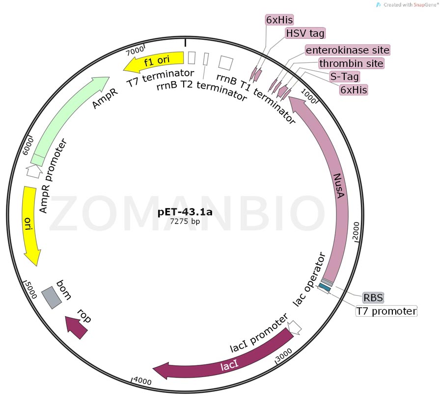 The pET-43.1 series of vectors are designed for cloning and high-level expression of peptide sequences fused with the 491 aa Nus?Tag protein. Unique sites are shown on the circle map. Note that the sequence is numbered by the pBR322 convention, so the T7 expression region is reversed on the circle map. The cloning/ expression region of the coding strand transcribed by T7 RNA polymerase is shown below. The f1 origin is oriented so that infection with helper phage will produce virions containing single stranded DNA that corresponds to the coding strand. Therefore, single stranded sequencing should be performed using the ColiDOWN primer. Vector encoded sequence can be completely removed when cloning into the PshA I or Sma I sites (as shown below) by cleaving the Nus?Tag fusion protein with enterokinase or thrombin, respectively. 質粒只保證關鍵序列正確,不保證表達效果。
