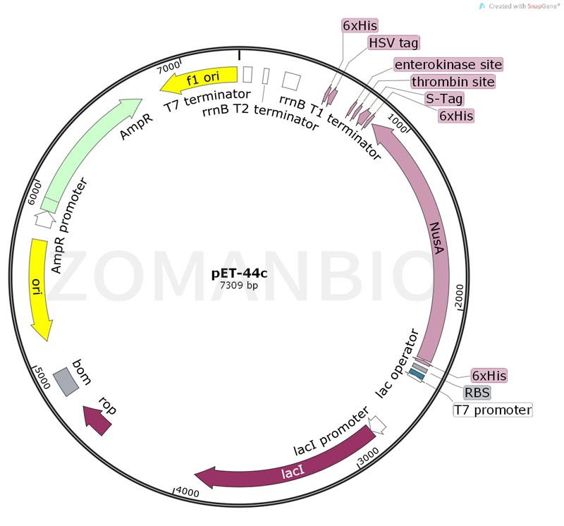 The pET-44 vectors are designed for cloning and high-level expression of peptide sequences fused with the 495 aa Nus?Tag? protein. Compared to the pET-43.1 series, the pET-44 vectors encode an additional N-terminal His?Tag. Unique sites are shown on the circle map. Note that the sequence is numbered by the pBR322 convention, so the T7 expression region is reversed on the circle map. The cloning/expression region of the coding strand transcribed by T7 RNA polymerase is shown below. The f1 origin is oriented so that infection with helper phage will produce virions containing single stranded DNA that corresponds to the coding strand. Therefore, single stranded sequencing should be performed using the COLIDOWN primer . Vector encoded sequence can be completely removed when cloning into the PshA I or Sma I sites (as shown below) by cleaving the Nus?Tag fusion protein with enterokinase or thrombin, respectively. 質粒只保證關鍵序列正確,不保證表達效果。