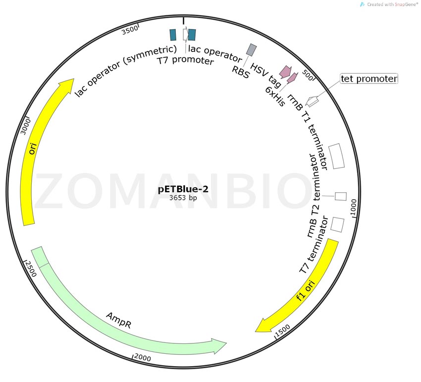 pETBlue-2是一個大腸桿菌pET系列表達質(zhì)粒。The pETBlue?-2 vector is designed to identify recombinants by traditional blue/white screening while also allowing T7lac promoter based expression of target genes. Screening is independent of expression because the T7lac expression promoter is in an opposed orientation relative to the E. coli promoter that mediates blue/white screening. pETBlue-2 defines the open reading frame and inserts must be cloned in-frame if expression is desired. The vector features an expanded multiple cloning site (MCS) and optional C-terminal HSV?Tag? and His?Tag? sequences. The sequence is numbered from the first base of the T7 promoter sequence.