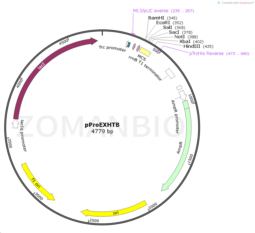 pProEXHTB質粒是一種原核表達載體, N端含有一個6×His標簽和一個TEV位點。該質粒含有多個常用的酶切位點,便于不同基因克隆。