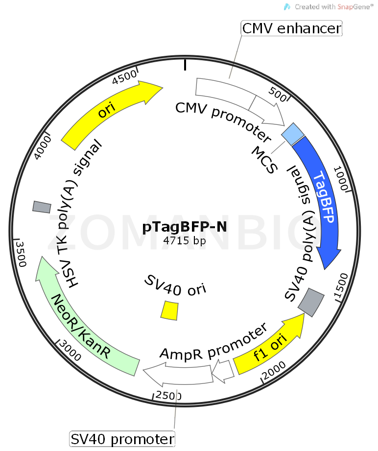 pTagBFP-N is a mammalian expression vector encoding blue fluorescent protein TagBFP. The vector allows generation of fusions to the TagBFP N-terminus and expression of TagBFP fusions or TagBFP alone in eukaryotic (mammalian) cells.