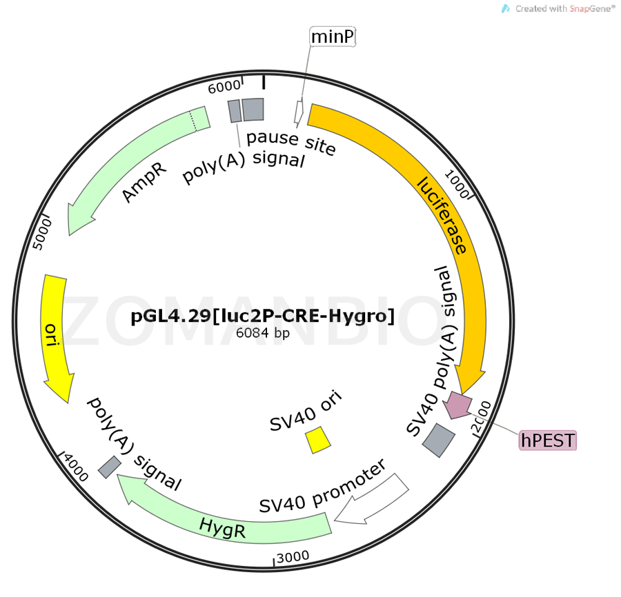 The pGL4.29[luc2P/CRE/Hygro] Vector(a–f) contains a cAMP response element (CRE) that drives the transcription of the luciferase reporter gene luc2P (Photinus pyralis). luc2P is a synthetically-derived luciferase sequence with humanized codon optimization that is designed for high expression and reduced anomalous transcription. The luc2P gene contains hPEST, a protein destabilization sequence. The protein encoded by luc2P responds more quickly than the protein encoded by the luc2 gene upon induction. The vector backbone contains an ampicillin resistance gene to allow selection in E. coli and a mammalian selectable marker for hygromycin resistance.