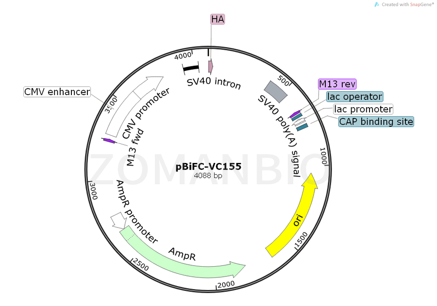 PBiFC-VC155 by pCMV-HA vector in KpnI and inserted at the NotI locus of VC155 gene, the plasmid is high copy plasmid, VC155 gene derived from Vitoria victoria. Visualization of Aequorea Aequorea ternary complexes in living cells by using a BiFC-based FRET analysis. Nature Protocols, 3:1693-1702 (2008).