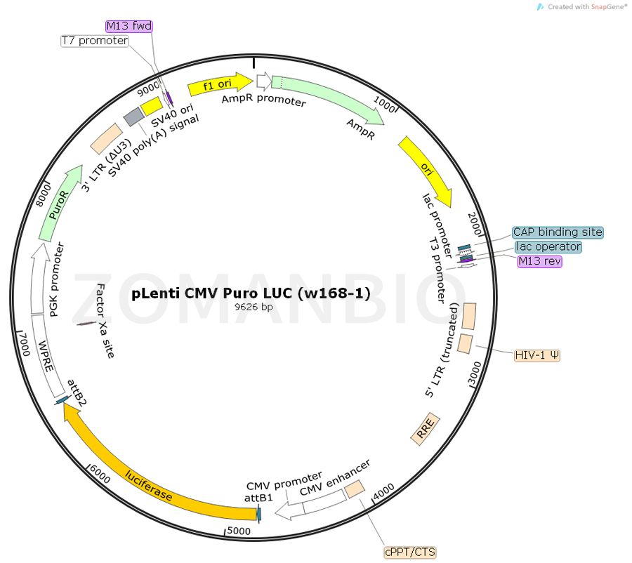 質粒序列請下載:ZK805pLenti CMV Puro LUC (w168-1) 慢病毒表達質粒.txt