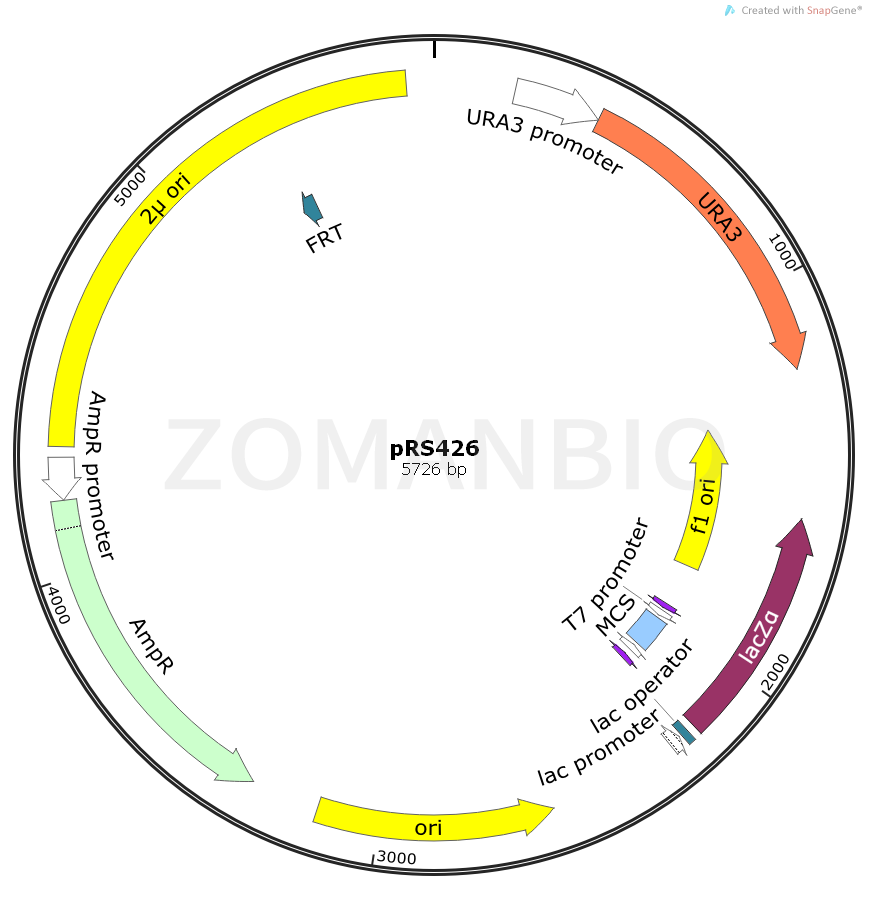 The order of the major features in this plasmid is:ori(f1) - lacZ - T7 promoter - MCS (KpnI-SacI) - T3 promoter - lacI - ori(pMB1) - ampR - ori (2 micron) - URA3. Contains the REP3 and FRT sequences necessary for high copy propagation in yeast. In S. cerevisiae, the copy number is about 20 per haploid cell. In non-selective growth, plasmids are lost through mitotic segregation at rates in the range of 4.4 + or - 1.4% of progeny per doubling. YE-type shuttle vector encoding the beta-galactosidase alpha peptide, permitting blue-white visual detection. Can be used to produce ssDNA. Contains promoters for in vitro RNA synthesis and priming sites useful for sequencing. Restriction digests of the clone give the following sizes (kb): BamHI--5.8; EcoRI--5.8; PstI--4.0, 1.7; PvuII--5.2, 0.54. (ATCC staff) Medium is 1227 LB plus ampicillin. NCBI gi: 416322 Hosts: E.coli DH5alpha, Saccharomyces cerevisiae, E.coli.