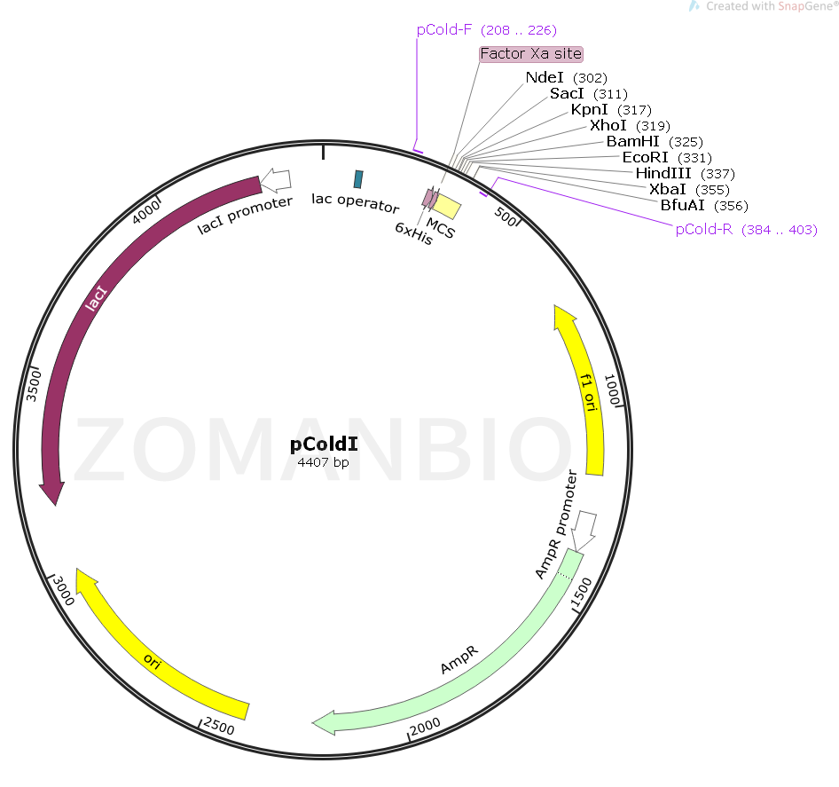 pColdI質(zhì)粒是利用冷休克基因CSPA啟動子設(shè)計高效率蛋白質(zhì)表達(dá)載體。在啟動子下游處,插入了lac操縱子,以便嚴(yán)格控制表達(dá)。此外,5’非翻譯區(qū)(5’UTR),翻譯增強(qiáng)元件(TEE),His標(biāo)簽序列,Xa因子切割位點(diǎn)和多克隆位點(diǎn)(MCS)位于CAPS啟動子的下游。當(dāng)培養(yǎng)溫度切換到低溫時,大腸桿菌暫時停止生長,大部分的大腸桿菌蛋白質(zhì)表達(dá)減少,但是一類稱為冷休克蛋白的蛋白質(zhì)被特異性誘導(dǎo)表達(dá)。