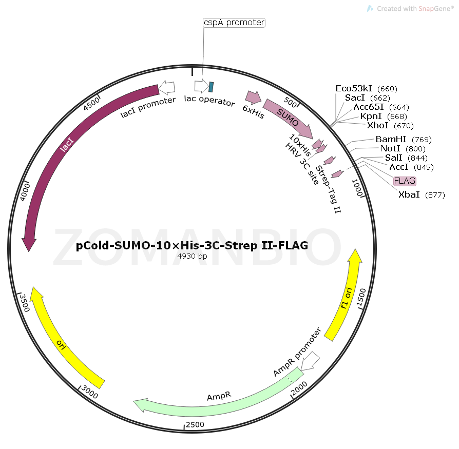 pCold-SUMO-10×His-3C-Strep II-FLAG質粒是一個可以在低溫環境下表達的大腸桿菌載體。