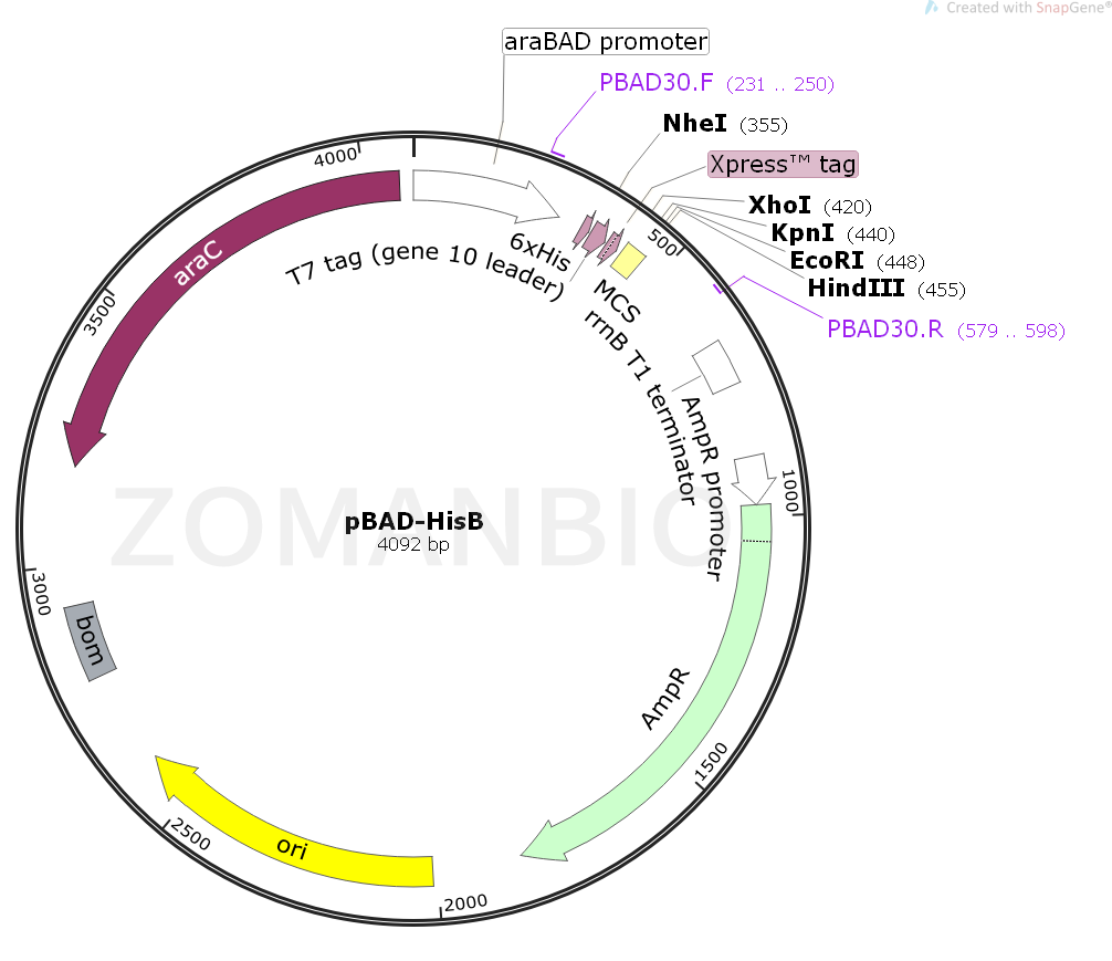 pBAD-HisB質粒是衍生于pBR322載體。載體設計用來在大腸桿菌中進行可調節,劑量依賴性的表達和純化重組目的蛋白。使大腸桿菌araBAD啟動子(pBAD)增強了大腸桿菌重組蛋白可溶性表達的水平。pBAD/His和pBAD/Myc His載體上的調節蛋白AraC能夠調控pBad啟動子。pBAD/Myc-His B 載體是阿拉伯糖調控載體,在無葡萄糖的培養基中,阿拉伯糖正向調控目的基因的表達,通過調節阿拉伯糖的濃度水平來優化目的蛋白的可溶性表達。