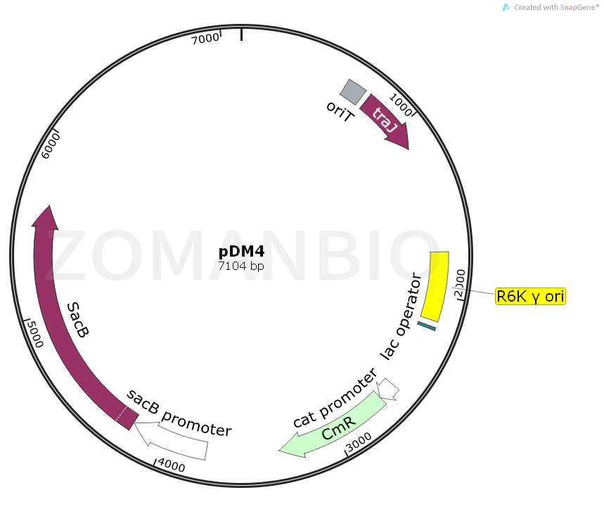 pDM4質(zhì)粒是一種自殺型載體,在轉(zhuǎn)化的時候需要用含pri基因的菌株,復(fù)制子是R6Kγori,oriT,質(zhì)粒大小是7104bp,帶有氯霉素抗性,通過抗生素抗性篩選大量復(fù)制擴增,培養(yǎng)條件是LB,37℃,有氧。