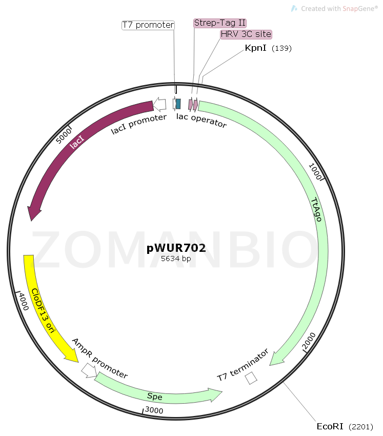 pWUR702質粒可誘導表達TtAgo蛋白,在N端攜帶有Strep-Tag II標簽和HRV 3C site蛋白酶酶切位點。本質粒參考文獻為:DNA-guided DNA interference by a prokaryotic Argonaute.?
