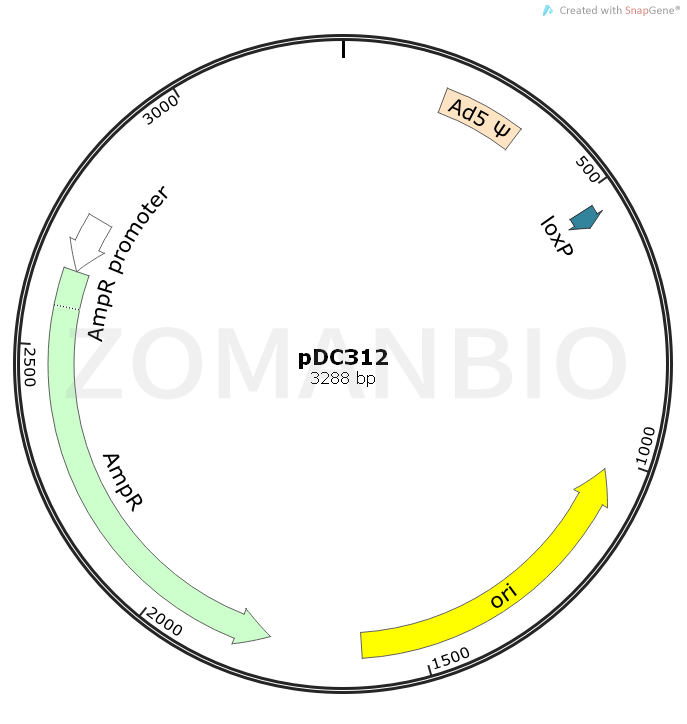 pDC312質(zhì)粒是一個腺病毒表達(dá)載體,MCS處前后無CMV啟動子和poly A終止子,方便插入完整表達(dá)盒。