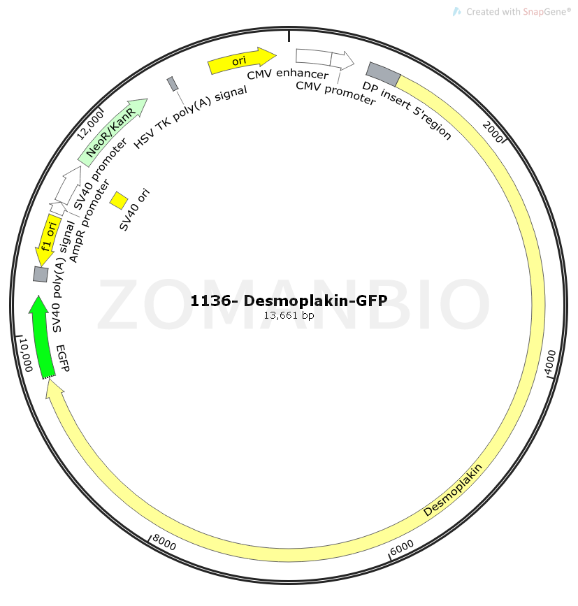 1136- Desmoplakin-GFP質(zhì)粒是一個(gè)哺乳細(xì)胞過(guò)表達(dá)質(zhì)粒,CMV啟動(dòng)子驅(qū)動(dòng)Desmoplakin人源基因和EGFP綠色熒光蛋白融合表達(dá)。該質(zhì)粒的參考文獻(xiàn)是:Desmoplakin assembly dynamics in four dimensions: multiple phases differentially regulated by intermediate filaments and actin.
